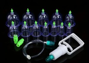 Set de 12 ventuze pentru terapie, ideal pentru relaxare, reducerea durerii musculare și stimularea circulației sanguine. Include pompă manuală pentru vacuum și ventuze de diferite dimensiuni, reutilizabile și ușor de utilizat acasă.